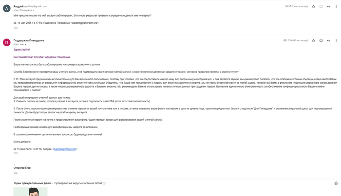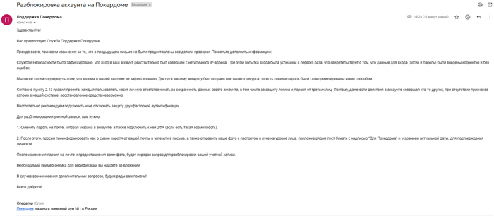 Что не играли на покердом пару месяцев, туда не заходили и они получили письмо о взломе и блокирование аккаунта.