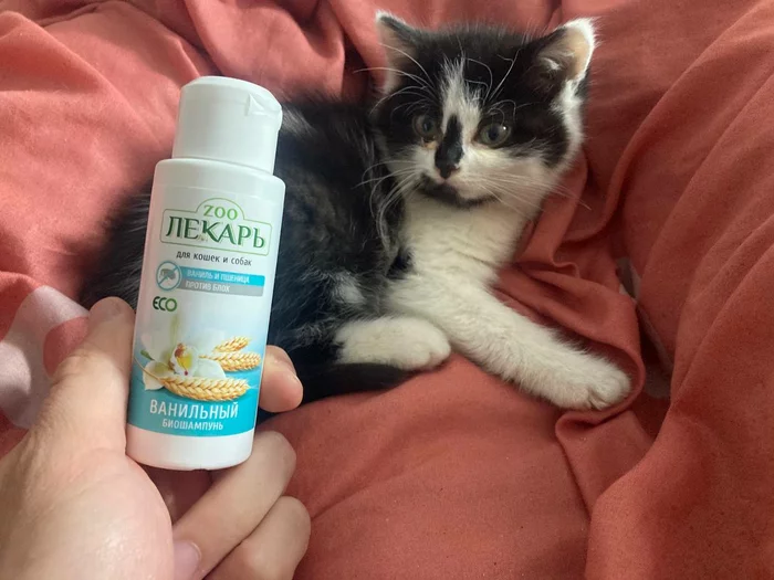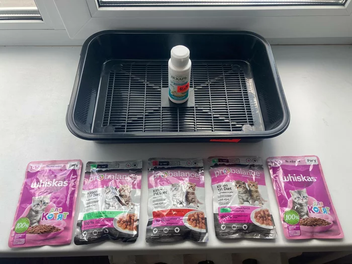 Поездив по ветаптекам везде говорили, что маленького котёнка лучше не капать. Капать можно только с 3-12 месяцев. Везде говорили по-разному. Хотя как мне казалось, для котят тоже должно быть средство от блох. Поэтому селафорт для котят на WB я всё-таки заказал. Но в итоге, посоветовавшись с соседкой решили, что малую просто искупаем с кошачьим шампунем. Я поехал и купил шампунь, заодно взял ей лоток, наполнитель и хавчик. Хотя она у меня вообще всё ест. Макароны ей жевал, говядину, а рис так вообще за обе щеки уплетает. Даже шоколад ест.