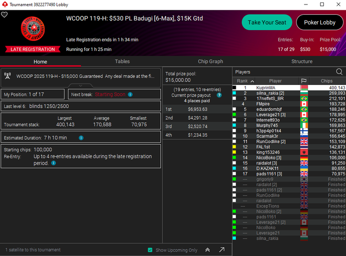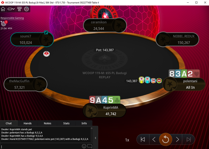 Финалка началась с двух крупных проигранных раздач, поэтому в 7-мах был ультра коротким, но не сдавался. В итоге раскрутился и дошёл до 3-мах, где снова стал чип-лидером. Самое интересное, что в 3-мах мы остались с моим беккером Виталей, которого я сегодня на свою голову потренировал перед игрой в бадуги , и с одним из самых сильных регов в PL Badugi, у которого результаты даже лучше, чем у меня (да-да, это не шутка). Мы с ним каждый день уже много лет играем свои ежедневные бадуги. В итоге беккер занимает 1-ое, а я 2-ое. Значит тренировка прошла не зря. Для Витали вообще идеальный расклад получился. Надеюсь, он ещё и общий лидерборд теперь удержит. Ну а мне конечно хотелось завоевать трофей, но акцент я как обычно делал исключительно на качество игры, а ей я остался доволен. При том, что даже ре-энтри не использовал. В общем, сегодня оформил бесткэш. Не зря всё-таки приехал. Ещё и битву блогов выиграл третий раз.