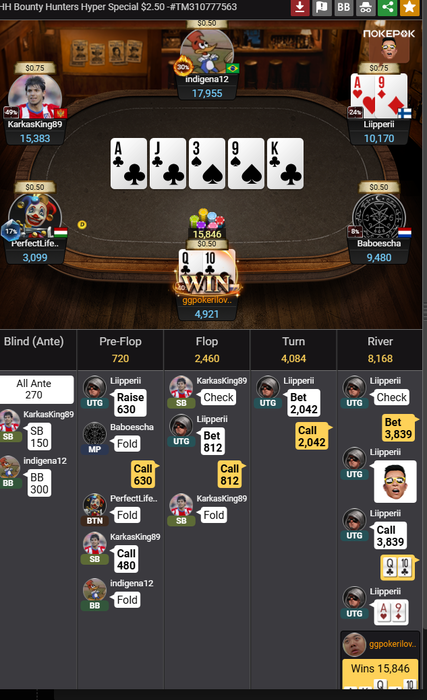 ну сам бтв плохо сыграл можно было об чипака удвоится но я зачем то решил трибетить тузов в его 3.5 опен с сб в бб и он выкинул, потом 5 опенов где мне инста трибет прилетал, потом две постфлоп метки по 7 бб и вот тот же чипак с сб пихает у меня 15бб А7 я кол там К6 и я отвалился