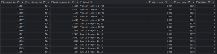 В итоге получилось более 15 000 сезонов. Сейчас готовлю базу к следующему этапу - загрузке турнирных таблиц для всех этих сезонов.