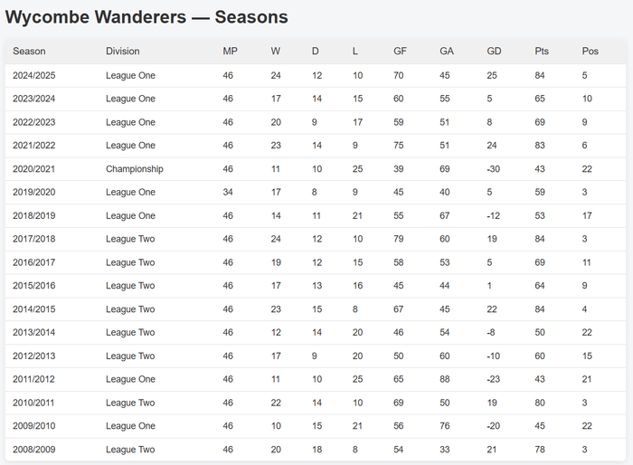 И последнее что удалось уже реализорвать - История выступлений клуба. Есть простая страница с результатами команды по сезонам (например, Wycombe Wanderers). Пока - только итоги (место, победы/ничьи/поражения, голы, очки).