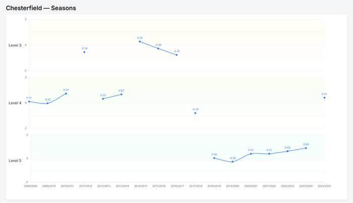 Команда вышла на пик в сезоне 14/15: тогда в третьем по силе дивизионе у нее было +0.28 гола за игру. Но дальше началось свободное падение – в каждом из следующих двух сезонов разница ухудшалась на катастрофические -0.5 гола за игру. Команда вылетела в четвертый дивизион, где в первый же сезон сыграла с разницей -0.78 – даже хуже, чем годом ранее в третьем. Результат – новое понижение. Только спустя два сезона в пятом дивизионе удалось остановить это падение. И с тех пор, на протяжении четырех сезонов в пятом дивизионе, команда стабильно улучшала показатели. В итоге, спустя шесть лет, она сделала +0.89 за игру и вернулась в четвертый дивизион. А там – уже солидные +0.41 гола за матч. Очевидно, что в последние годы Честерфилд развивается. Пять лет подряд – стабильный рост. Значит, руководство работает грамотно.