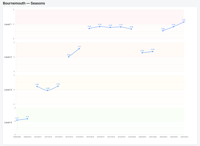 На графике выше показано, как сезон за сезоном росла сила команды Борнмут – по показателю "разница голов / количество матчей в чемпионате". Хорошо видно, как команда в 2008 году выступала в четвертом по уровню дивизионе Англии и постепенно шаг за шагом добралась до АПЛ. Также можно отследить, в какие сезоны ее показатели улучшались, а в какие – проседали. Для меня это один из ключевых инструментов анализа перспектив команд на следующий сезон. Благодаря таким графикам я смогу оценивать, где команда, скорее всего, будет развиваться и улучшать результаты – а где наоборот.