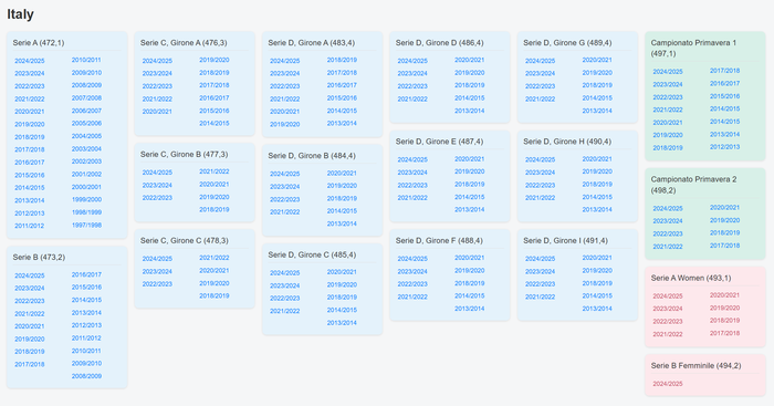 Следующим добавлением стали Турниры и Сезоны. Для каждой страны отображаются все доступные турниры и их сезонов. Например, для Италии сразу видно, сколько там лиг и дивизионов.