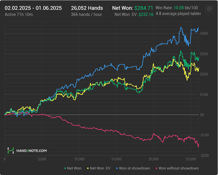 Привет. Никита, РФ, 21 год. На форуме зарегистрирован давненько, но ничего не писал. С покером знаком 4+- года, но плотно играть сел только сейчас, тк лечился от тревожного расстройства (ГТР). Помимо игры, увлекаюсь философией. Играю, пока, только PokerKing. Начинал с НЛ10, поиграл недельку, начал подключать НЛ25. Играю так себе, но учусь. На форуме хочу познакомиться с интересными ребятами и учиться вместе. График пока такой(даты с января, тк немного поиграл за последние 4 месяца).