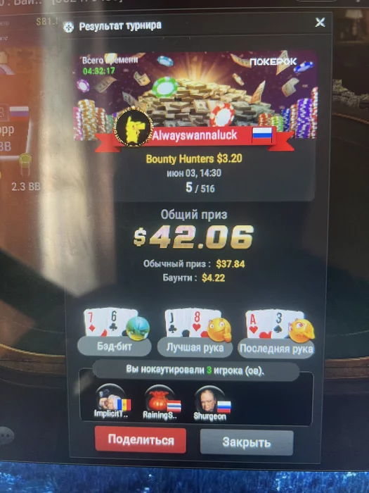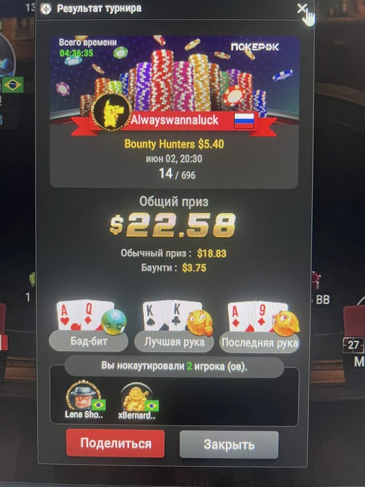 Ставки ушли на задний план, я держусь уже год. Желания ставить нет, а вот побеждать в покер есть. Принимаю решение уволиться с работы и посвятить свою жизнь покеру. Я не ошибся, сейчас я играю средние лимиты, аби 20. Играю на покерке, ник мой Alwayswannaluck и также стримлю, найти и задать мне все вопросы можно на кике, так как твич запрещает играть в азарные игры. Свои результаты и свой путь я буду показывать и рассказывать здесь. Я с Вами, всем удачи за столами