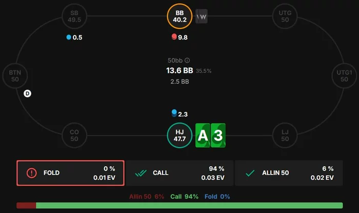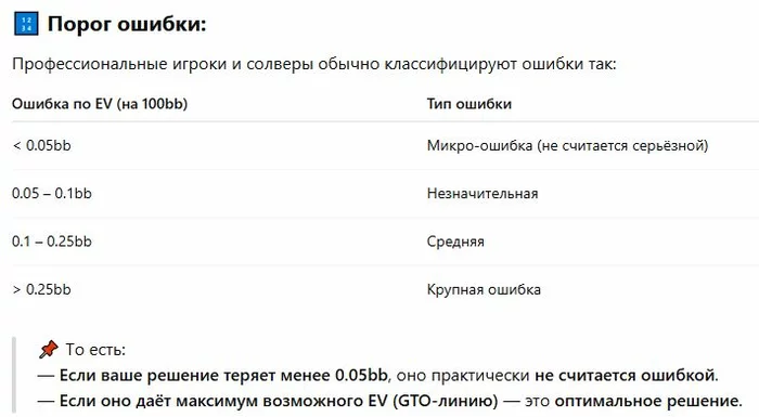 Всем привет. Выполняю упражнения в программе "GTO Wizard". В некоторых случаях программа указывает на то, что я ошибся, и показывает EV 0.01 для моего решения, в то время как правильная линия — это CALL с EV 0.03. В таком случае, считаются ли такие отклонения ошибками, и какой диапазон отклонений от оптимальной линии по EV можно считать незначительным?