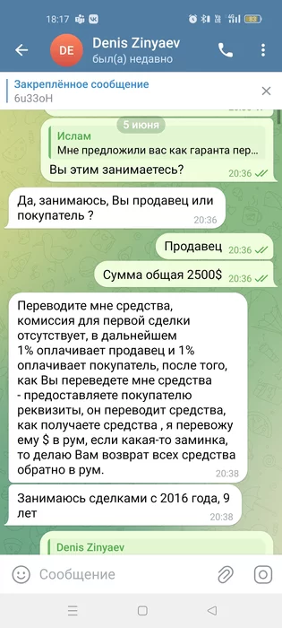 Проблема в том, что в его профиле нет ссылки на телеграм, поэтому я не вижу доказательств того, что ты действительно договаривался с Зиняевым. Выглядит, как будто кидала воспользовался именем человека с репутацией в качестве гаранта и потом от его имени с тобой разговаривал.
