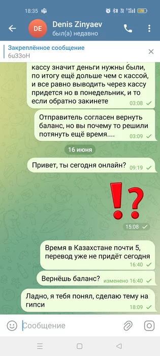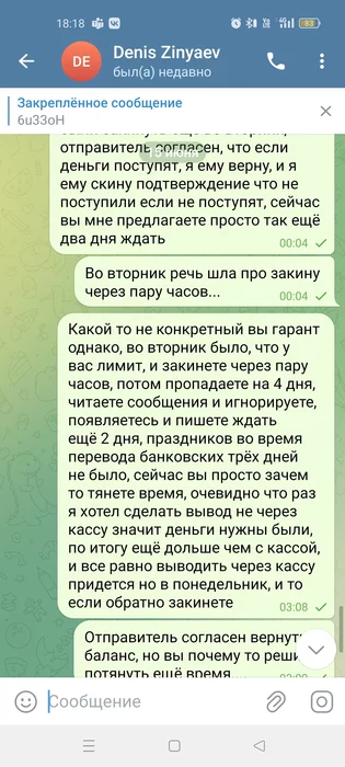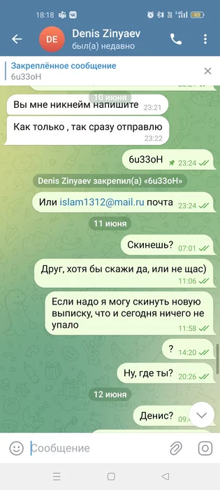 Банковский перевод от отправителя не пришел сразу, но была представлена квитанция. На вопросы Зиняеву он ответил что если деньги так и не придут, то вернёт баланс во вторник. К вторнику деньги так и не пришли, и вечером я ему написал с просьбой вернуть баланс на покерок, был получен ответ, что у него суточный лимит, и переведет когда он обновится, на следующий день я написал ему утром, он прочитав проигнорировал, и дальнейшие сообщения не читал 2 дня, после двух дней зашёл прочитал, не ответил и вновь пропал, но отвечал отправителю денег что не может общаться в данный момент. В субботу ночью, написал что не может отвечать и вернётся в сеть воскресенье в 22 по МСК. Деньги возвращать отказался по причине того что не прошло три дня, хотя они прошли уже в среду, и три дня не затрагивали праздничные дни четверг и пятницу, обещал что в понедельник если не поступит, то будет сделан возврат. И вновь, воскресенье, и понедельник полный игнор. Прошу принять какие либо меры, я понимаю что деньги вернуть это вряд ли поможет, но пусть другие не поведутся.