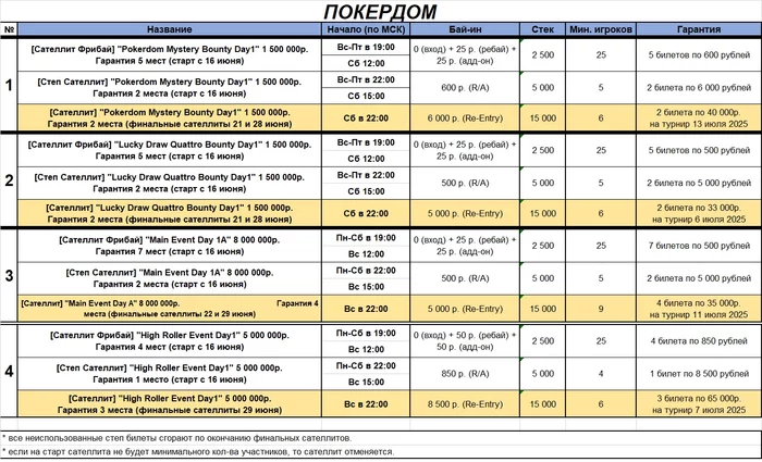 - Main Event Day 1A (финальные сателлиты пройдут 22 и 29 июня в 22:00 мск)