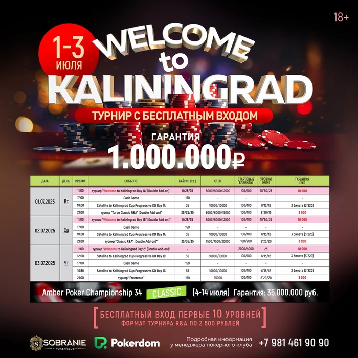 В преддверии этого события с 1 по 3 июля будем рады всех видеть на турнире Wellcome to Kaliningrad с гарантией 1 000 000 рублей! Это турнир с бесплатным входом и ребаями по 2500 руб.