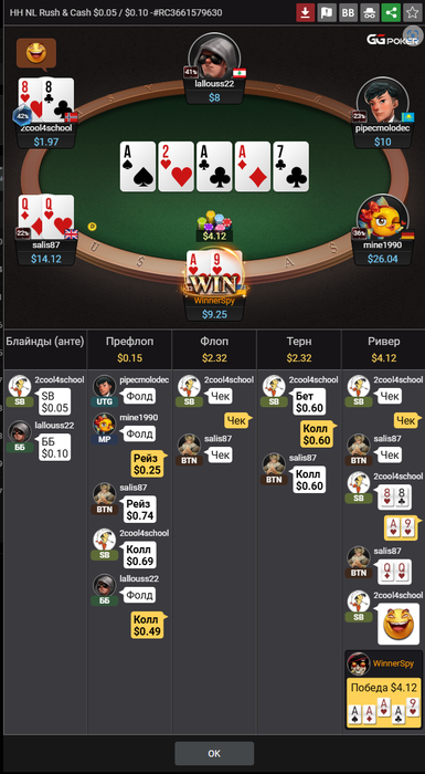У оппа рука AAAQQ у меня АААА9, две карманные карты у меня и унего участвуют.