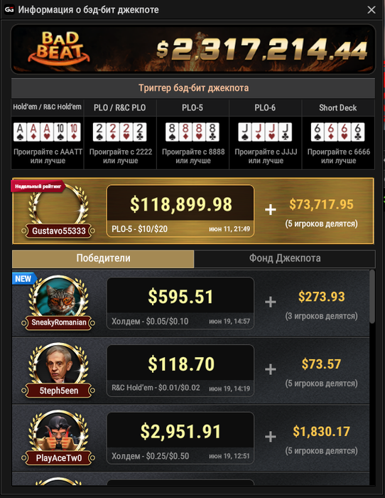 Рекомендуємо для участі в Bad Beat Jackpot обирати класичні кеш-столи NL Hold'em, де активовано цю функцію."