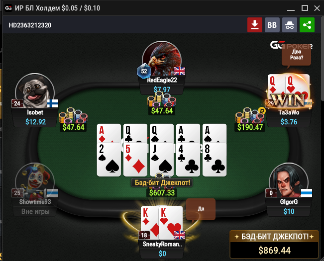Чтобы комбинация участвовала в джекпоте, необходимо собрать каре, имея карманную пару на руках.
