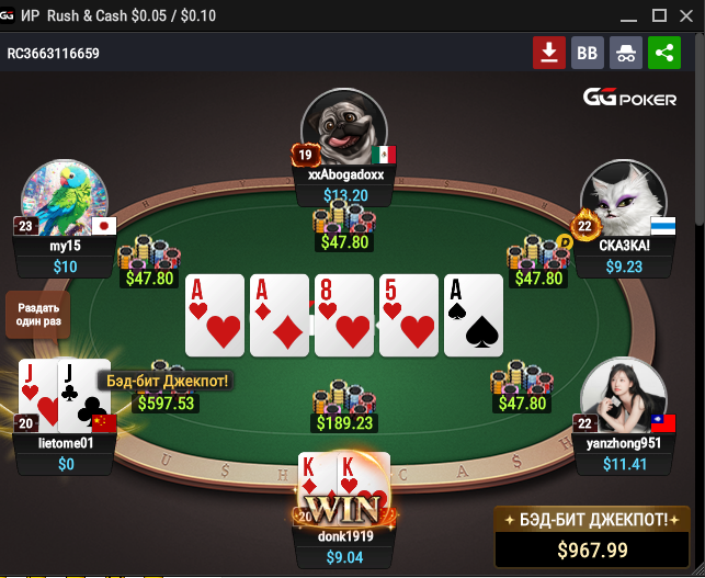 Ваша роздача відповідає технічним умовам, однак формат Rush & Cash наразі не бере участі в системі Bad Beat Jackpot. Участь у джекпоті можлива лише за столами з відповідною позначкою "Bad Beat Eligible" (наприклад, де це прямо вказано в лобі або в кеш-іграх без швидкого переміщення).