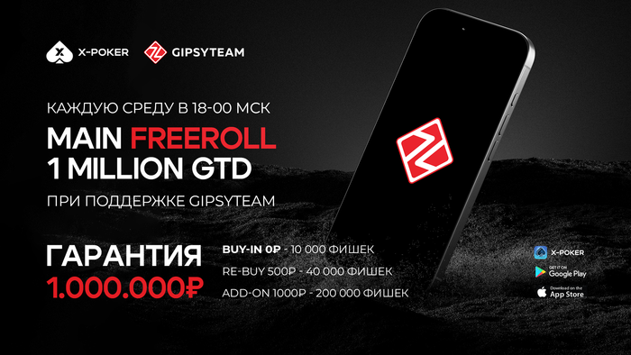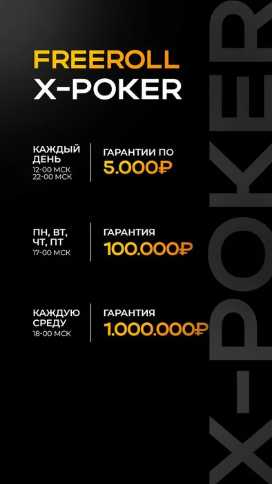Бесплатный турнир с гарантией 1 000 000 рублей на X-POKER каждую среду в 18-00 мск.