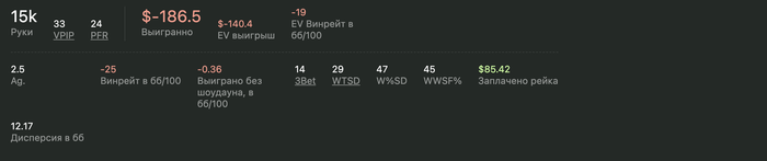 - недобор по EV 35$ + при анализе больших банков много кулеров (диапазон моего 5бета: AA,AK,KK, иногда QQ и JJ по игроку). Тут вижу просто дисперсию, рук немного, планирую оценивать после 100К рук, вернется на дистанции