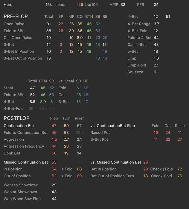 Слишком лузовые опены с ранних, при этом дико низкие фолды на 3бет, это точно надо исправлять. Выигрыш на шд должен быть минимум на 10 больше при твоём ввсф, скорее всего не справляешься фолдить там где надо, либо переигрывает руки сам. Агрессии на поздних улицах не хватает, а на флопе можно и снизить, там деньги не делаются.