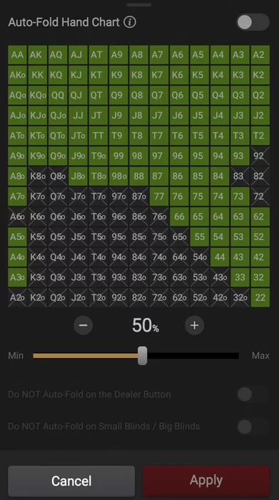 Привет, не совсем понятно что ты имеешь в виду -это матрица выбора рук для автофолда, он будет со всех позиций, и что тебе нравится такой рейндж как на последнем скрине открывать с BU?
