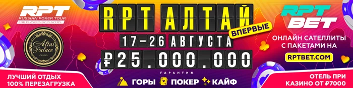 💰💰 Встречайте сателлитную сетку для первого в истории этапа RPT 17-26 августа на Алтае. В руме RPTBET (rptbet99.com) можно выиграть как билет, так и пакет с проживанием и деньгами на расходы. Отбор пройдет в три самых массовых и популярных турнира: