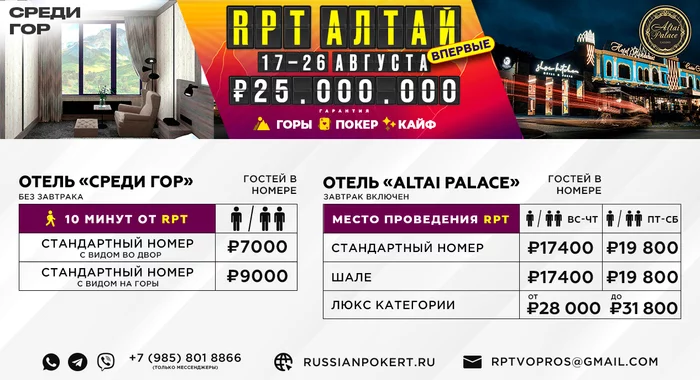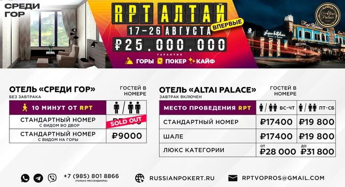 💰 Бесплатный отель для кэшэвиков и значительная скидка на проживание для турнирных игроков — разбираем пакетные предложения к серии RPT 17-26 августа на Алтае!