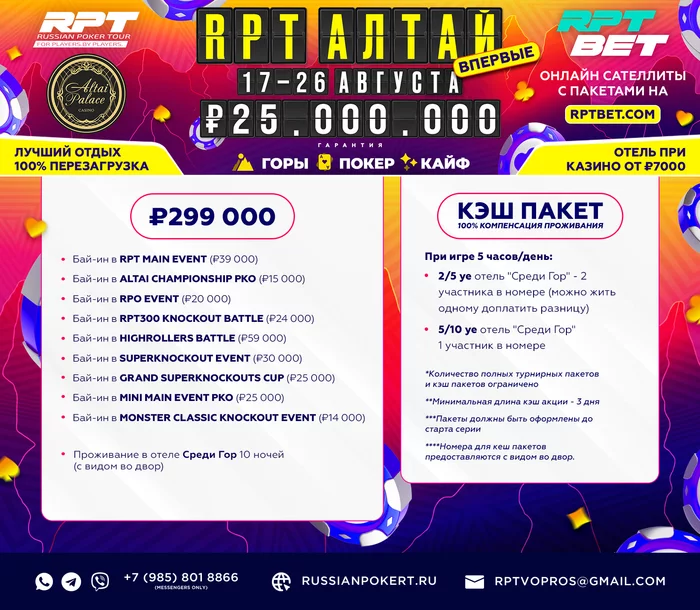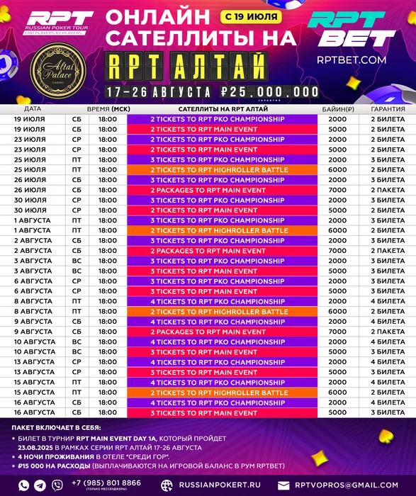 🏆 Традиционно, рум RPTBET гарантированно разыграет множество билетов и пакетов в ключевые турниры серии. Достаточно будет плодотворно потрудиться в онлайн-сателлитах до серии, чтобы приехать на Алтай и в расслабленной обстановке просто получать удовольствие от игры.