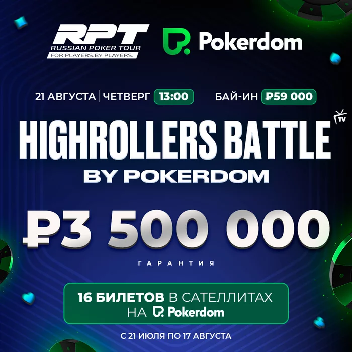 🏆 Рум RPTBET также разыгрывает билеты в турнир Хайроллеров! Финальный сателлит будет проходить каждую субботу, в 19:00 по МСК — бай-ин ₽6,000, гарантия — 2 билета в турнир Хайроллеров.