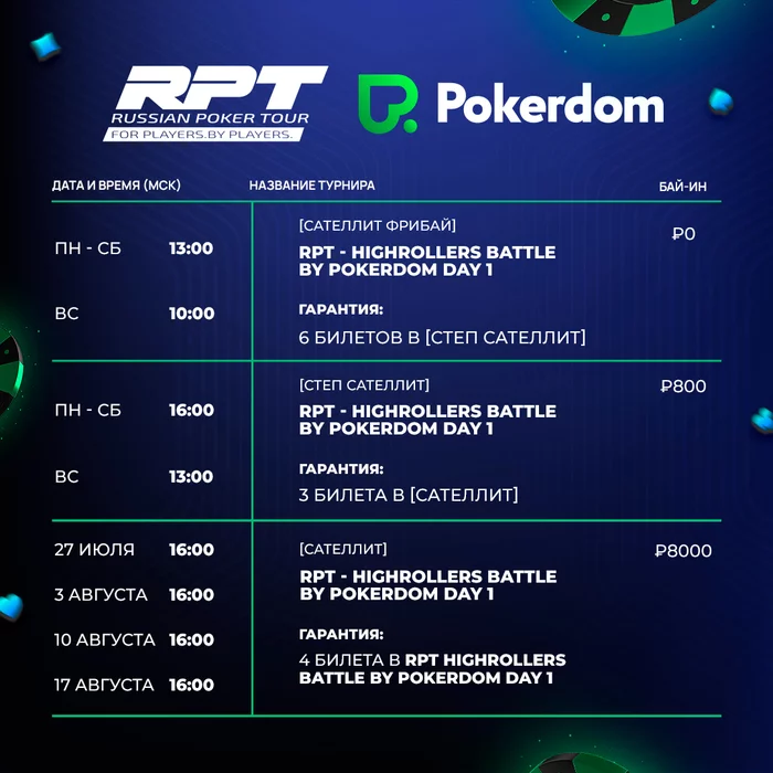 — Онлайн-сателлиты в румах RPTBET и Покердом (разыграют десятки билетов и пакетов с проживанием)