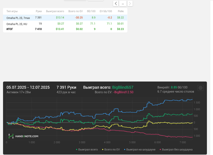 И вот 3 недели я играю Омаху. Подумал, зайду на НЛ 10, ну не должны мне напихать, как оказалось, что я ещё бездарней, чем думал. Укатка 7 стеков за пару дней с мыслями, что ну все, приплыли. Тут тебе любой кинет на прогиб и потрогает твою менталку на прочность. Сел, закурил и думаю: бля, а игра то прикольная, надо тестировать. По началу играл, что отыграю свою дистанцию в Техасе и немного буду поигрывать, но как оказалось, что захожу в Техас, а игра не то. Вот не тянет. Хочу уже дождаться вечера и сесть в Омашку и чисто по джазить с мальчишками. И так я перекатился в Омаху, ищу материал, стримы, вводы, курсы, и понимаю, что 6 часов теорий — а я не устал, дайте ещё вкусноты. И с каждым днем все лучше и лучше. Все начал пробовать на низких лимитах, и денег меньше проиграю, и опыта наберусь.