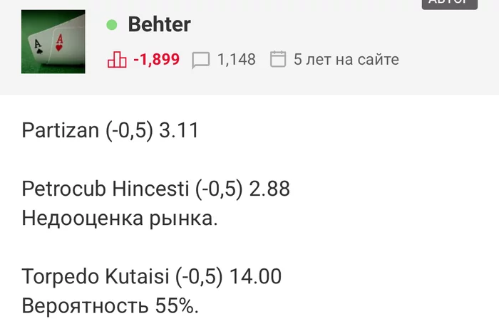 В последнее время в обсуждениях активно фигурирует Behter, и мнение о нём негативное. Многие утверждают, что он действует нечестно, он же пишет, что все нормально, обмана нет. Поэтому, чтобы разобраться в ситуации без эмоций и голословных утверждений, предлагаю провести проверку. В этой теме буду копировать его ставки на свои кровные. В итоге: спустя какое-то время все встанет на свои места. Погнали?