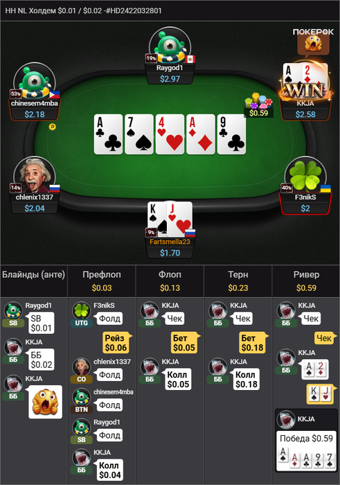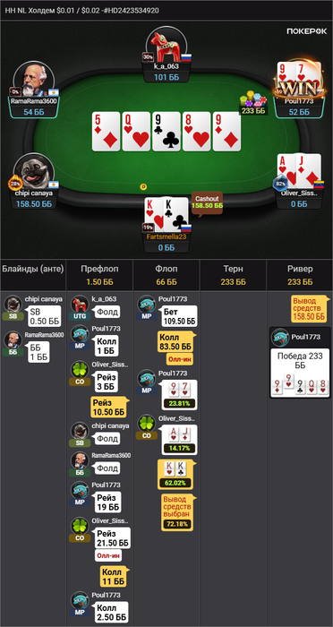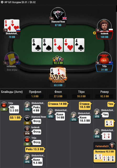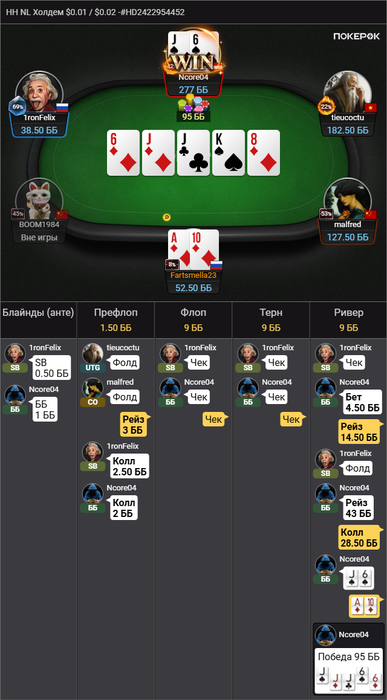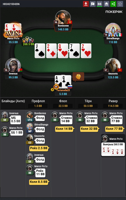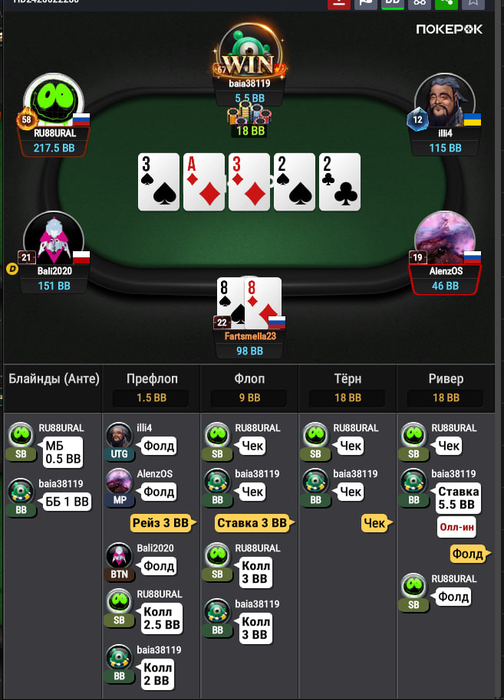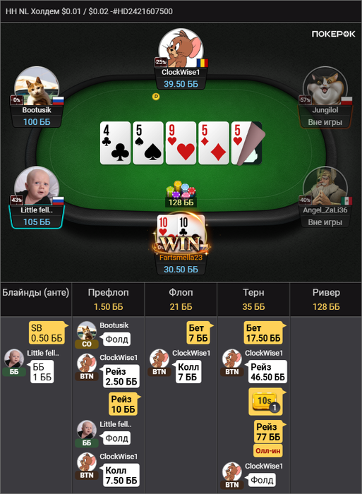 Здесь я нормально отыграл, но просто я вот сейчас утром это вижу, и понимаю, а хули тут думать епта? Опп впип 18, играет тайтово, опенрейз 2.5 бб, я 3бет, он колл. Флоп норм. Мы попали в сет, надо собирать деньги с ФД у чувачка. AA, KK,QQ он увел бы в 4бет, значит у него какие-нибудь туз хай сьютед, ну даже ладно король хай с. И вот тут моя ошибка. И что? зачем ставить 1/3? Типо не спугнуть оппонента и раскрутить его дальше? В общем ставил бы я 2/3 и проблем бы не было, терн вообще пуш, чтобы не залупался. На терне образумился, не смотря на то, что двойка закрыла оппу стрит с A4s(но A4 мало у него, возможно даже нету учитывая впип, вот A5s возможно), ставлю потбет. Оппонент коллирует, и сразу же донк алл ин в меня. Бля, вот что у него может быть тут кроме флеша? Хотя если честно, даже сейчас в меня закрадываются сомнения. Такого донк пуша я не ожидал вообще. Тут другой вопрос, он нам репрезентует здесь его закрытый флеш, который он так усердно колил. А другого быть и не может же? Или у него там были QQ какие-нибудь и он просто колил, и увидел что флеш закрылся и хорошо было бы сыграть алл ин полу блеф? В общем тяжелая ситуация. Но я считаю, голого блефа без велью тут не было, то есть были у него какие-то карманки, точно. Потому что с ничем колить потбет и играть донкпуш в надежде, что опп сфолдит на собранное фд это хуёвая игра.