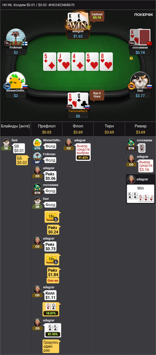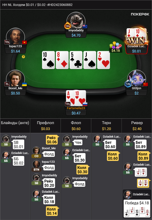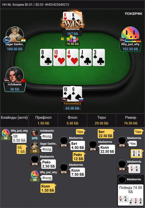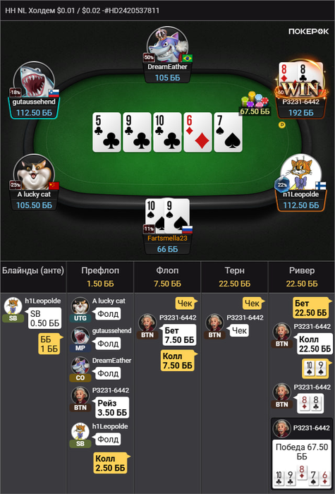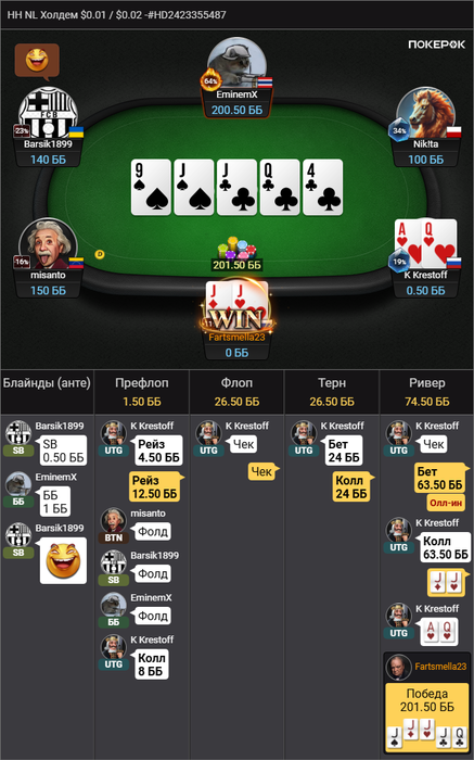 ЦИРК С КОНЯМИ БЛЯ ЕЙ-БОГУ! Стандартный колл на бб. 8 10 4, ага, значит опп рейзит 2/3, у меня топ пара, ага! Да похуй что сайзинг КБЕТА у него какой-то странный. Что-то рук нормальных не было🤔, исполняем! Зарейзил, подколил. Что изображаем? Стрит! Опачки, у нас ещё и двухстороночка! Пиздячим дальше, ну тут сдаемся