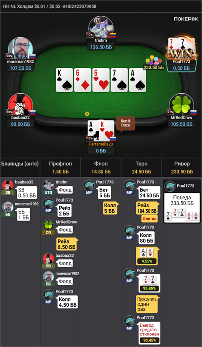 В общем мой бест дей евер, очень рад как играл. Сидел на полной концентрации. Только под конец второй сессии, последний час уже дергался и в тг лазил, ну ничего, поправимо. Понял что 7 часов могу катать спокойно. Были раздачи где чуть чуть тильтанулся, завтра утром будет разбор.