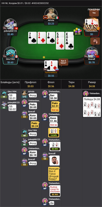 Четвертая раздача опять AA, ставлю 1/3 так как брод спаренный, много сд+фд, а также 10ки там точно могут быть, ставлю пол пота, но чуть снизил сайзинг(хз зачем, у меня интересная привычка так иногда делать, типо навсякий случай засейвить 2 бб если прилетит пуш). И тут я получаю олл ин, мне кажется колла тут вообще не было, так как пуш на терне с такой текстурой выглядит очень сильно.