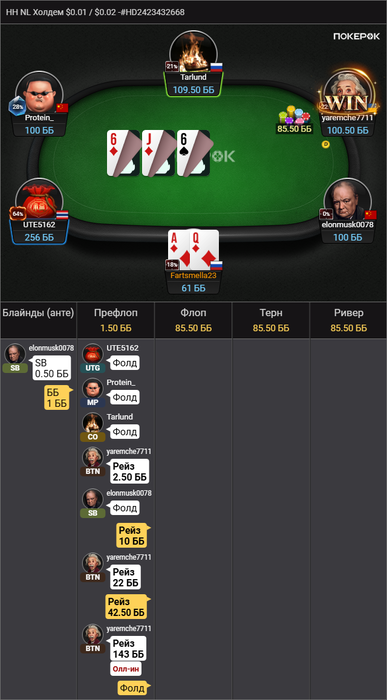 Раздач оказалось маловато. Всего 6. Одна префлоп, незначитальная.