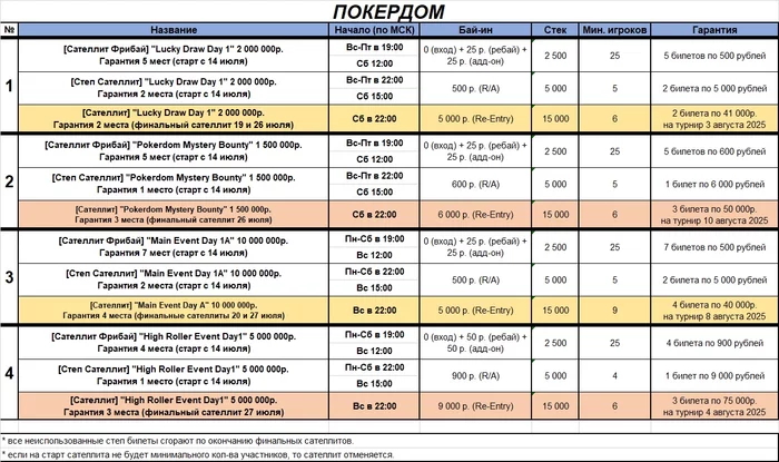 - Main Event Day 1A (финальные сателлиты пройдут 20 и 27 июля в 22:00 мск)