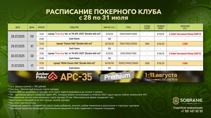 Стоимость участия - 25.000 руб. Стартовый стек – 35.000.