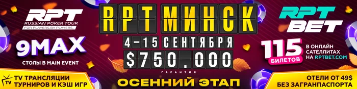 🏆 Более 20 масштабных турниров, невероятно насыщенное и доступное расписание, крутые развлечения и лучший покерный отдых! Приезжайте в прекрасный осенний Минск с 4 по 15 сентября, чтобы отлично провести время в компании единомышленников, поиграть в крутые турниры Russian Poker Tour и окунуться в атмосферу большого покерного фестиваля!