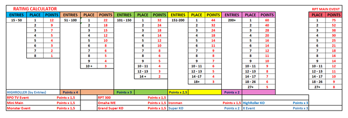 Размер начисляемых баллов зависит от общего количества участников в турнире и от его стоимости, поэтому внизу таблицы указаны коэффициенты, которые будут применены к определённым событиям.