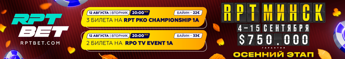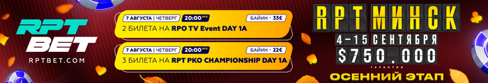 🏆🏆 Отборочные онлайн-сателлиты на RPT 4-15 сентября в Минске продолжаются — сегодня на RPTBET будут разыграны минимум ТРИ БИЛЕТА в Belarus PKO Championship, а также минимум ДВА БИЛЕТА в RPO TV Event.