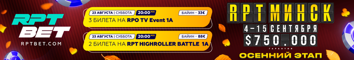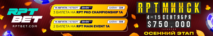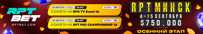 🏆🏆 Два щедрых онлайн-сателлита к серии RPT 4-15 сентября в Минске пройдут сегодня на RPTBET: разыграем минимум ДВА БИЛЕТА в RPT Main Event, а также минимум ТРИ БИЛЕТА в Belarus PKO Championship.