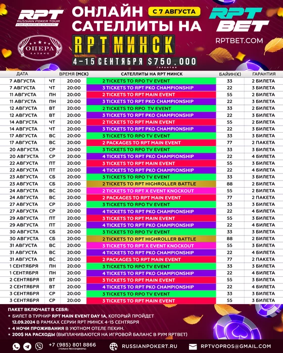 🚀🚀 В каждый из дней сателлитов гарантированно будет разыгрывается от 4 до 8 билетов и пакетов! Каждый из пакетов — это бай-ин в RPT Main Event ($590), 4 ночи в уютном отеле, а также $200 на расходы.
