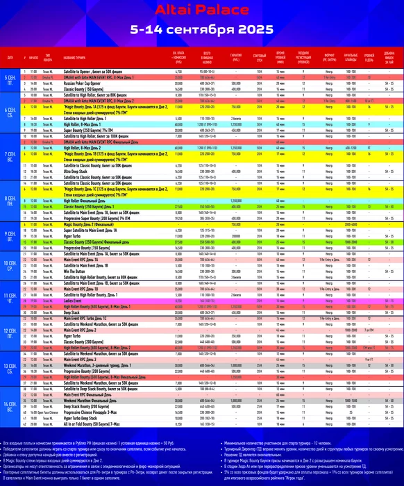 Также расписание и структуры турниров можно найти на странице серии на сайте: https://pokercm.com/tournaments/rpc-altaiv2/