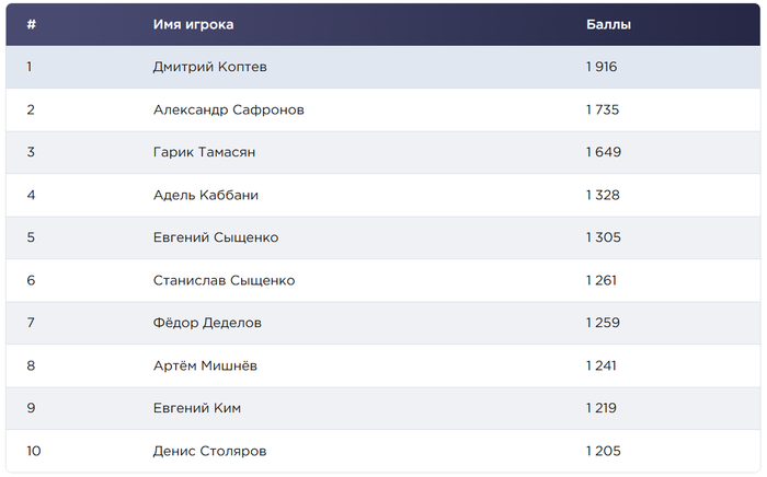 📈 Схема простая: за каждое попадание в призы в любом турнире на каждом из этапов RPC игрок будет получать баллы в общую таблицу лидеров. У кого после окончания декабрьской сочинской серии будет больше всего баллов, тот и выиграет. О том, как считаются баллы в эту таблицу, мы подробно рассказывали вам в специальном материале: