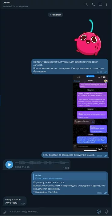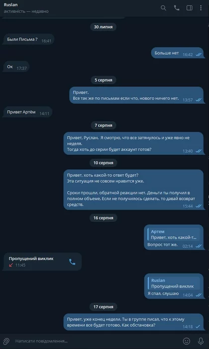 Писал также @f0rov (Антон), который был указан как запасной контакт. Антон сказал, что не понимает, зачем Ruslan оставил его для связи, так как он не имеет отношения к делу. Пообещал написать Ruslan’у, но ответа так и не получил.