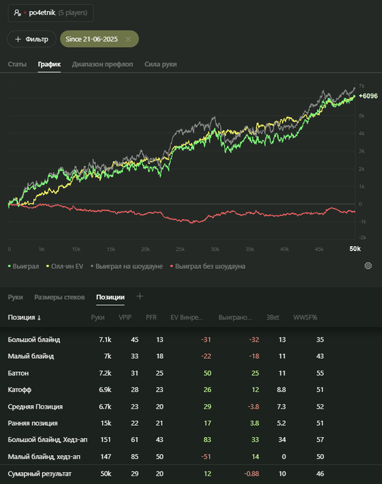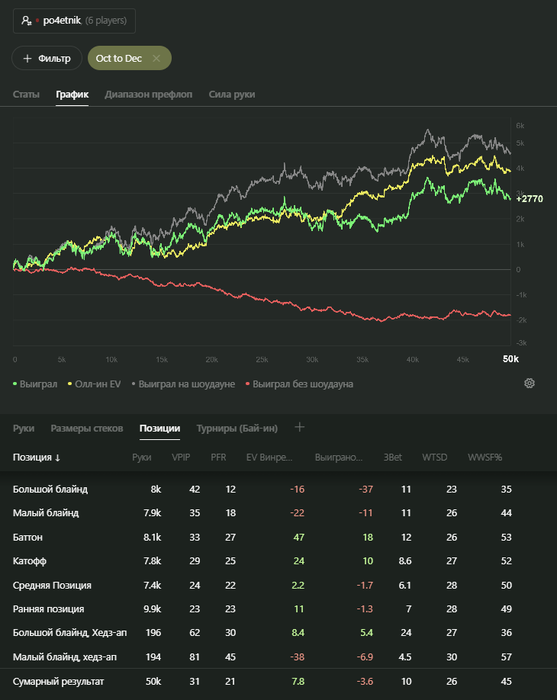 Начну с моих текущих результатом за последние 50К рук(график+бест кэш):