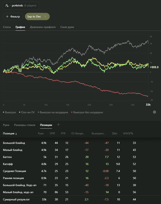 За последние полтора месяца ситуация особо не изменилась - катаю примерно 350 МТТ в месяц, слегка увеличилась ЕВшка , но денег нет) были мелкоафсные заносы - но критично на общий результат они не влияют. Продолжаю болтаться в мейке около 200 би.
