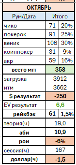 Прикладываю график + данные по октябрю. также дам скрин графика по деньгам за последние 110 сессий.