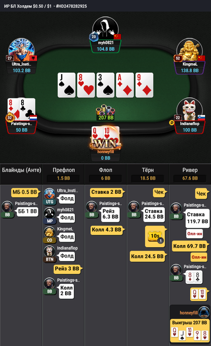 Красивая раздача была против випа на ГГ НЛ100. Буквально любой сайзинг коллит в 3-бэт поте на флопе, была надежда, что уж на 75% сфолдит, но нет. На следующих улицах он, как правило, не сдается и начинает блефовать. Я посчитал, что такой терн и ривер идеально для отбития.